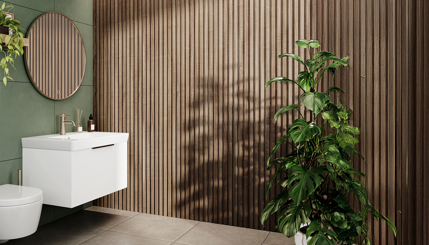 For a softer, more uniform finish, the Slatwall Waterproof Walnut/Walnut Wall Panel provides warm walnut tones throughout. This creates a calm, cohesive look that feels cosy yet sophisticated, an excellent choice for those seeking a spa-inspired feel in their bathroom.